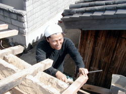 屋根の修理に関する基本的な作業手順はハヤシ君に教わりながら、柑子庵メンバーではややおぼつかない仕事を彼にやってもらいます。 D工さん同様に本職の大工である彼の動きはテキパキと速かったです。そして何より判断のスピードが速いのです。 「ここはこうなってるからこのやり方で行こう」という決め事をするのにほとんど時間をかけず、チラッと見ただけで決めていく。そしてそれをすぐさま行動に移し形にする。まさにプロフェッショナル! |