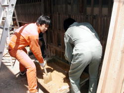 この日はついにやってきた瓦葺きのために大量の土が必要ということで、朝瓦を運び終えたら早速土つくりを開始します。とんでもない暑さの中、ただひたすら土の固まりを砕き、水を混ぜ合わせ捏ねます。 5分もしたらツナギの中は汗だくで、体のいろんなところを汗のしずくが流れていくのを感じながら、ひたすらざくざくやります。 |