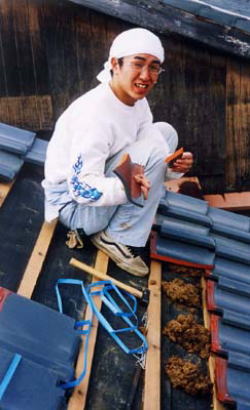 今まで何度も参加していながら、瓦葺きの作業はなぜかやったことがなかったと言うイッワハーラー君。要領よくこなしていく中で見事に瓦を叩き割ってくれました。 しかし実は一番最初に「瓦割り」をやってしまった人物は誰あろうD工名人であったりするので気にせずいきましょう。 |