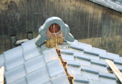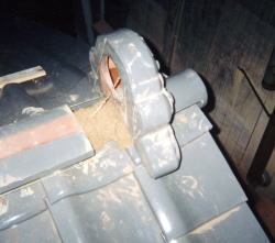 そんなこんなで何とか棟まで平瓦を葺き終わったら鬼瓦を乗せます。といっても、ふと気が付くとすでに棟梁が葺き終えてくれていました。 そんなことで良いんかな?・・・と思いつつも、すでに終わっていたので何も言う間がなかったのですが。 |