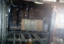 途中の絵は省いて作業終了状態。向こうの壁が見えました。黒く変色したこの壁、見えにくいですが左端にハシゴ状の黒い後が見えています。 もともと棚があったのか?それとも壁の中に何かあるのか? とにかく早く土を落として塗りなおしたいものです。 |