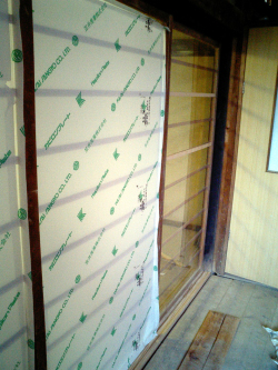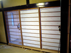 さて、前回トップページで紹介したこの建具ですが、元々雨戸として使用されていたものを、ベニヤ板をはずしてアクリル板を入れることで障子として使おうということになりました。 |