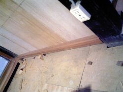D工名人にお願いして秋の間の建具(3枚引き)の敷居を入れ替えてもらいました。このあと外側に雨戸の敷居を入れて戸袋をつけたら完成です。 |