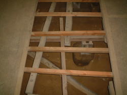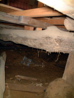 4番の部屋をほうきではいてきれいにした所で、「ちょっと床下の様子を見てみようか?」ということになり、床のコンパネを剥がしてみることにしました。 コンパネはかなり広い範囲で腐っていて、上を歩くのもちょっと危険なほどだったので、剥がす時に勢いよく引っ張ったら折れてしまいました。 で、これが床下です。古材と新材が組み合わさって用いられており、ここ10年〜15年くらいの間に誰かが修理したものと思われます。 |