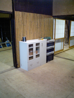 以前筒井家にあった古家具をここに持ってきました。元々はレコード盤を収納するための家具らしいです。この上にオーディオ機器を置く予定。